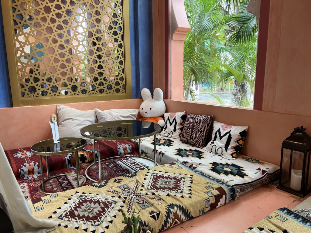 ホアヒンのミッフィーカフェは、ミッフィーが可愛いだけでなく、バンコクから向かってホアヒンの入り口にあるため休憩にちょうど良く、店内の雰囲気は中東・アラビアンスタイルで外国っぽさあり、そして席は座敷席もあるのでねんね期の赤ちゃんをゴロンさせられる大きなポイントがあります!