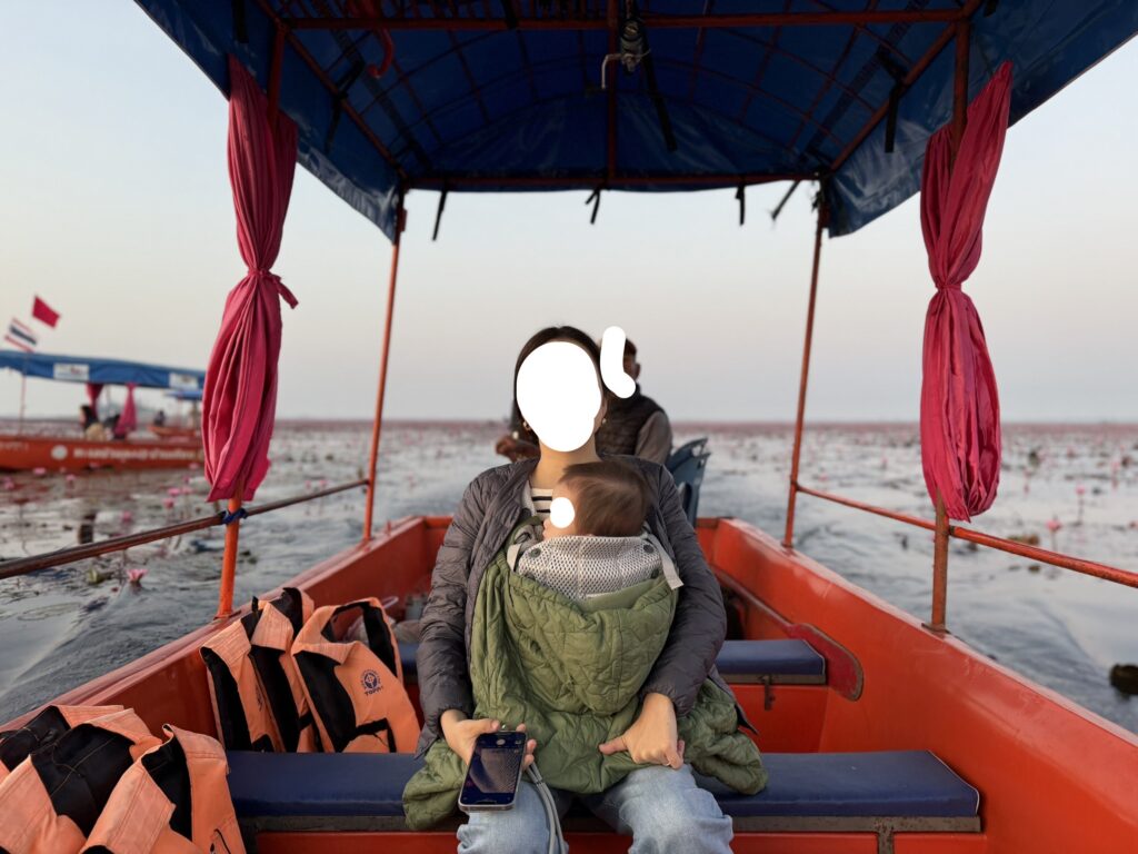 湖では小さいボートに1時間程乗船しなければならないので、1歳の動きたい盛りより抱っこ紐でおさまってくれる月齢の方がタレーブアデーンは行きやすいなと思いました。