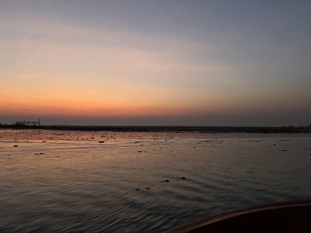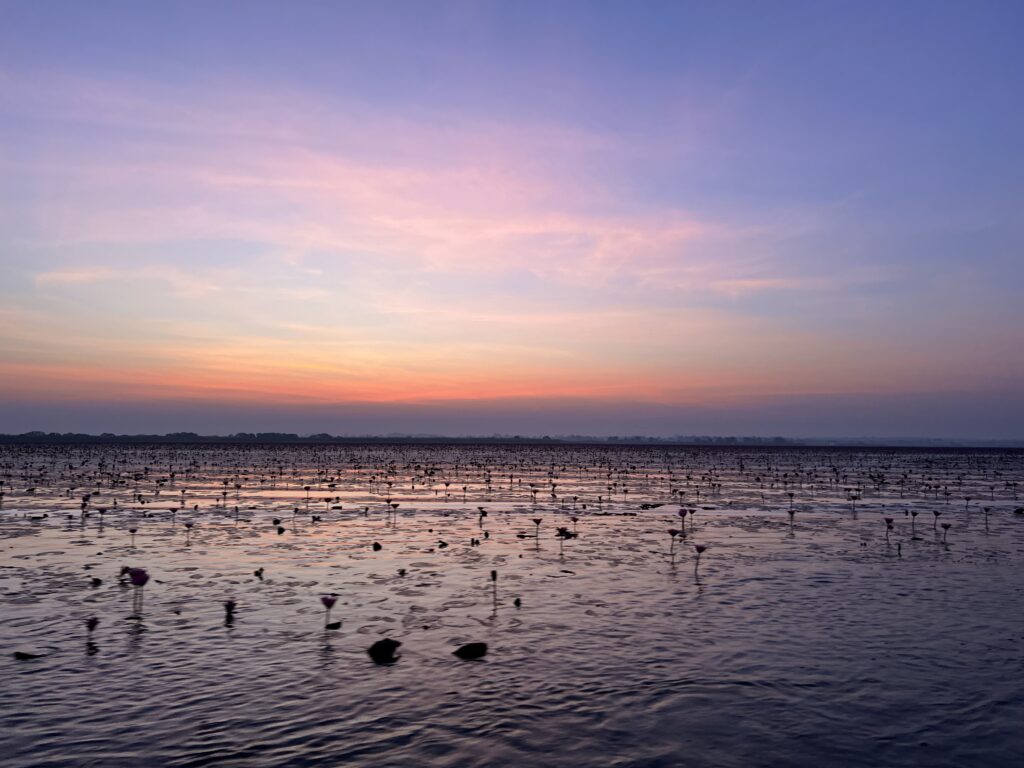 6時半近くになると空がもっと明るくなってきて、湖の中心地なのか蓮の数もグッと増えます。幻想的でとても綺麗。